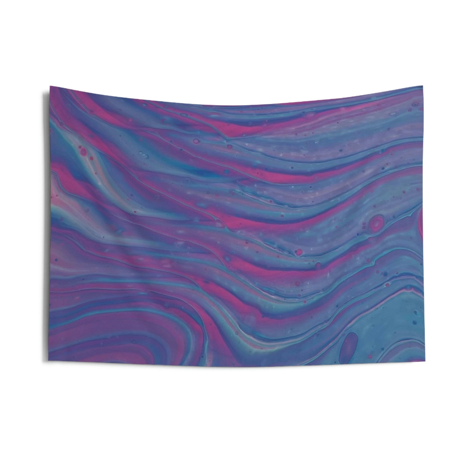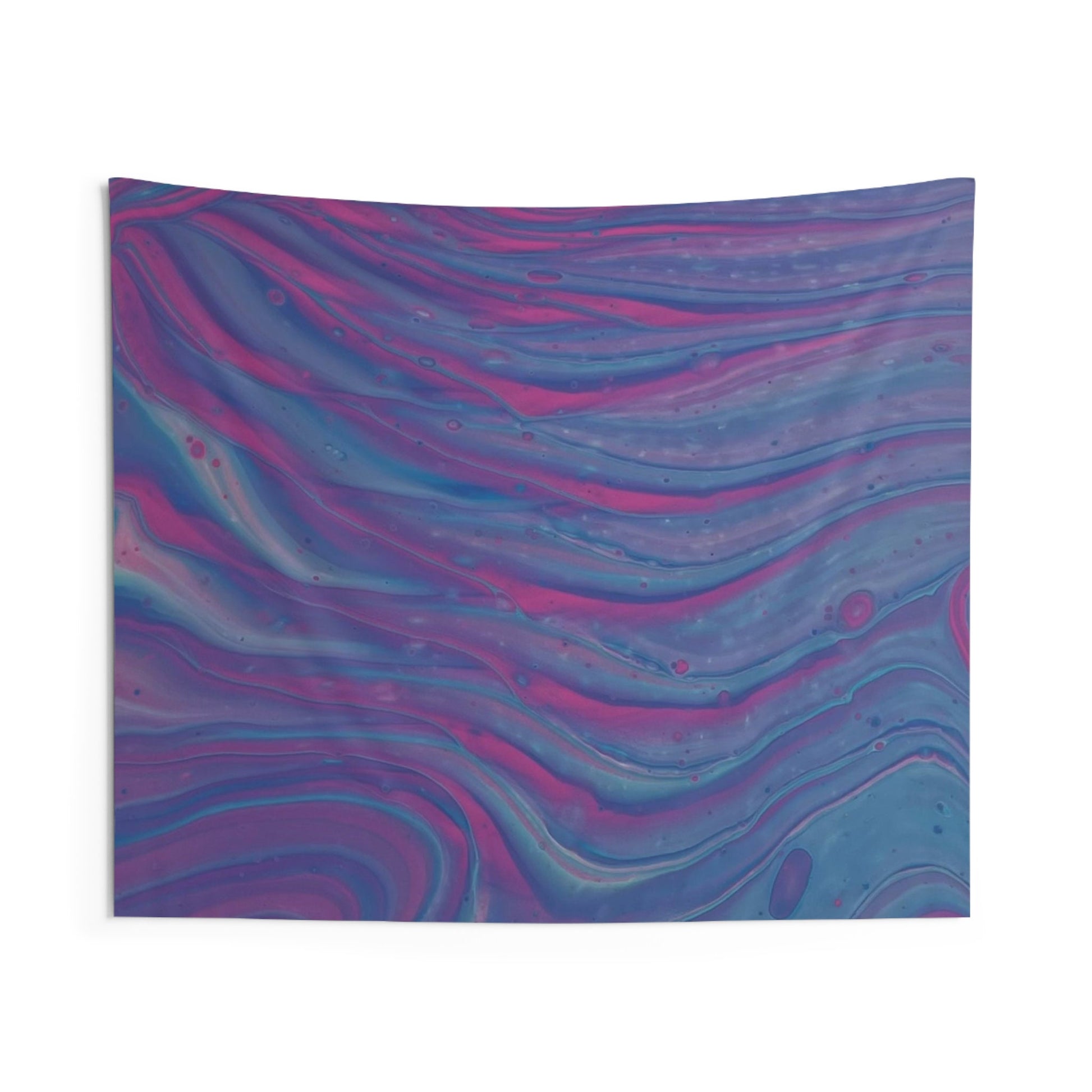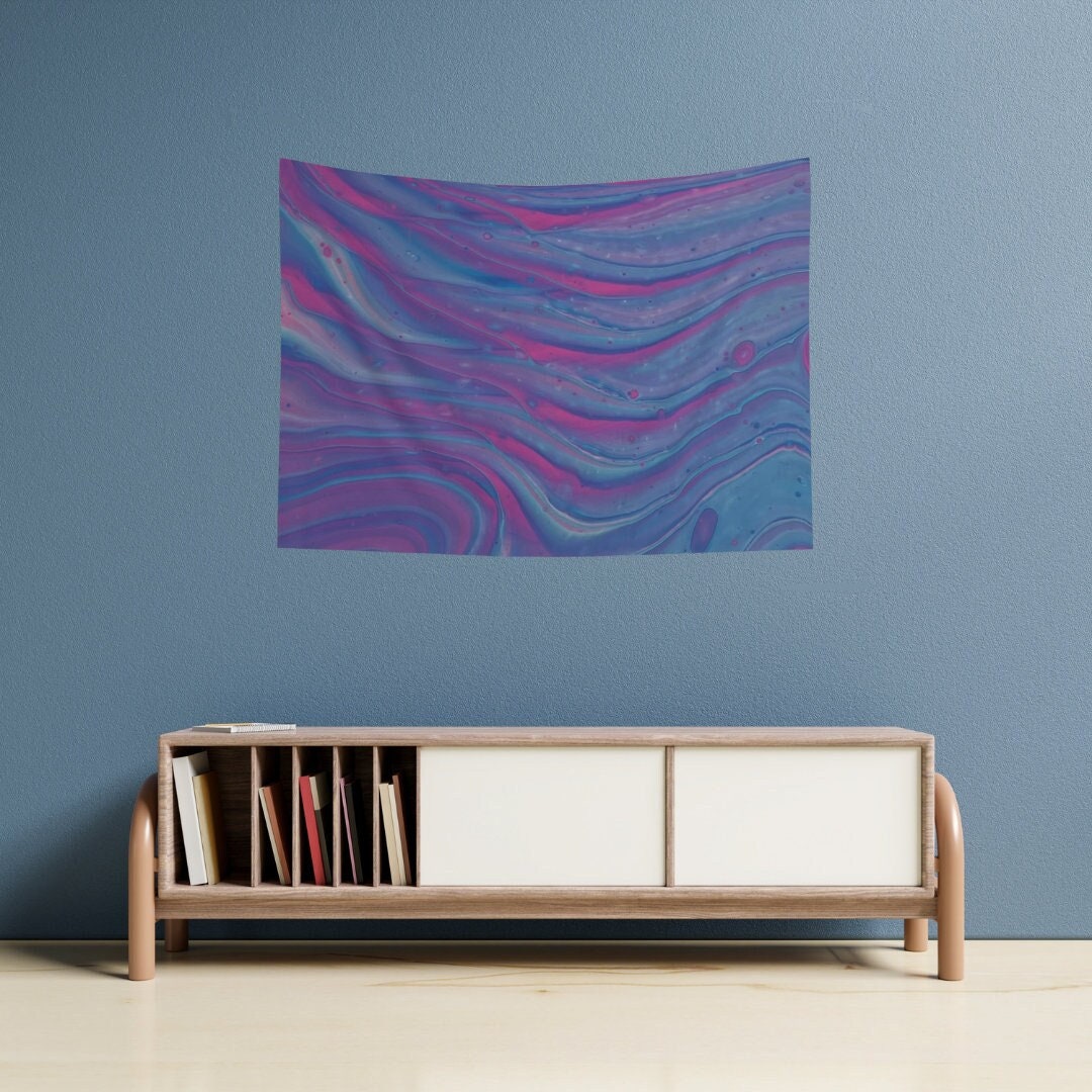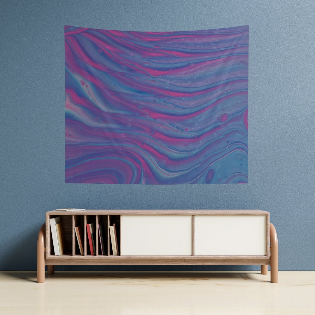 This tapestry is a perfect fusion of contemporary design and timeless elegance, dancing across the fabric in a wave-like pattern of blue and pink.