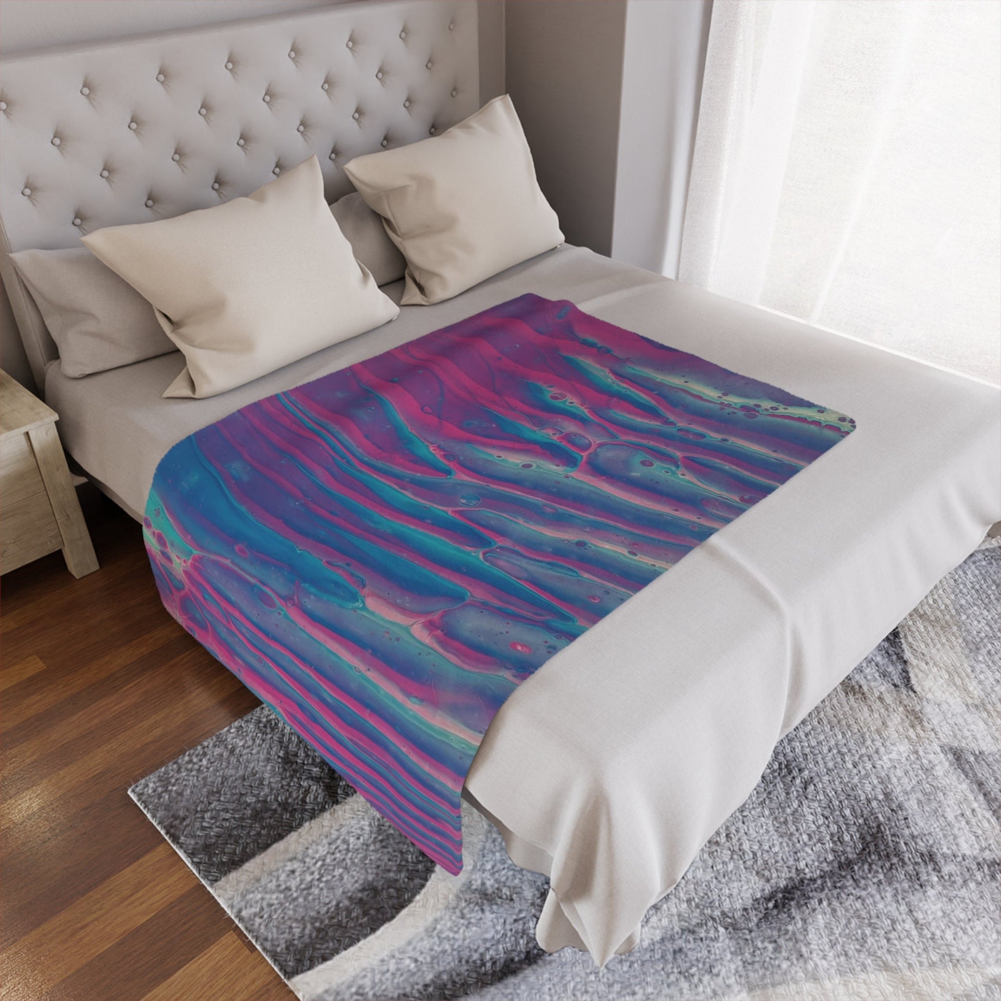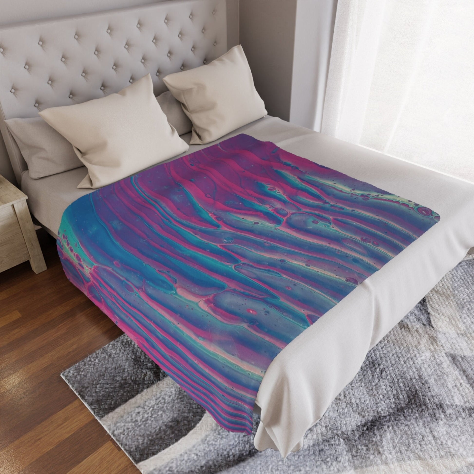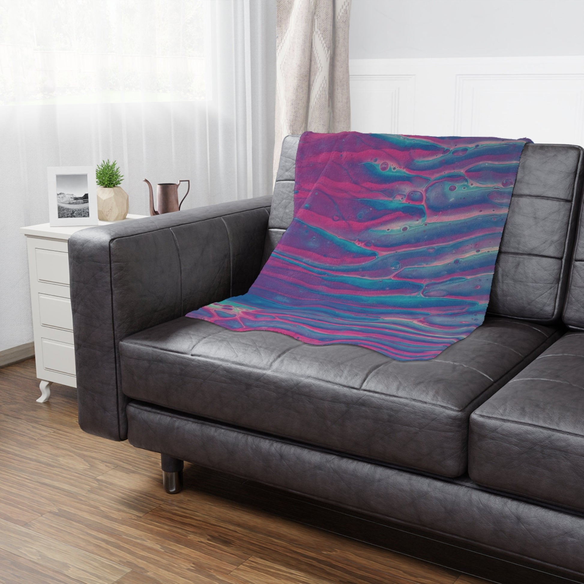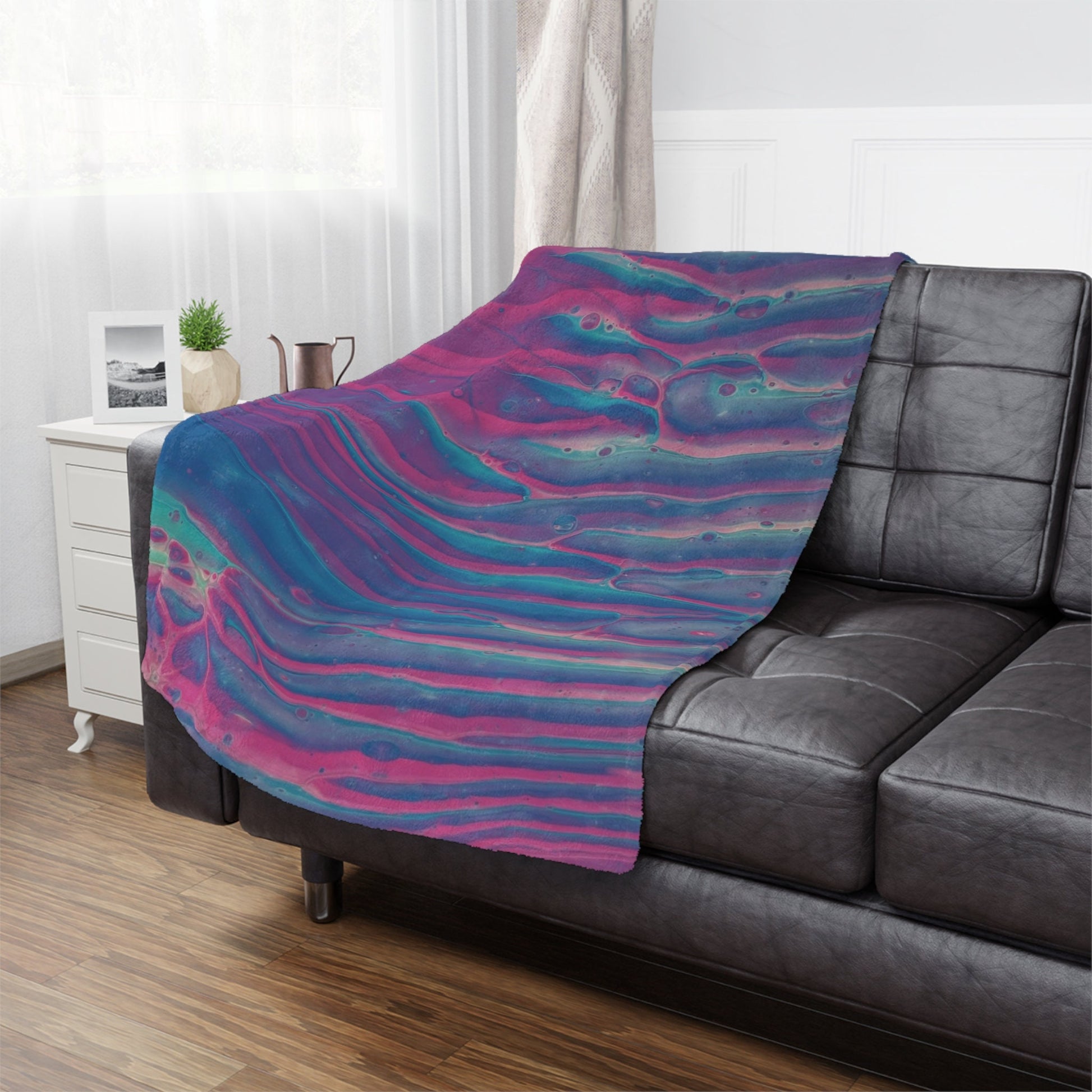Indulge in the luxurious embrace of our sunset wave minky blanket, where the soothing blend of pink and blue hues mirrors the enchanting colors of a sunset dancing on tranquil waters.